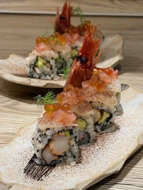 Gambero in tempura, avocado, in chiusura scampo prima scelta, shiso rosso